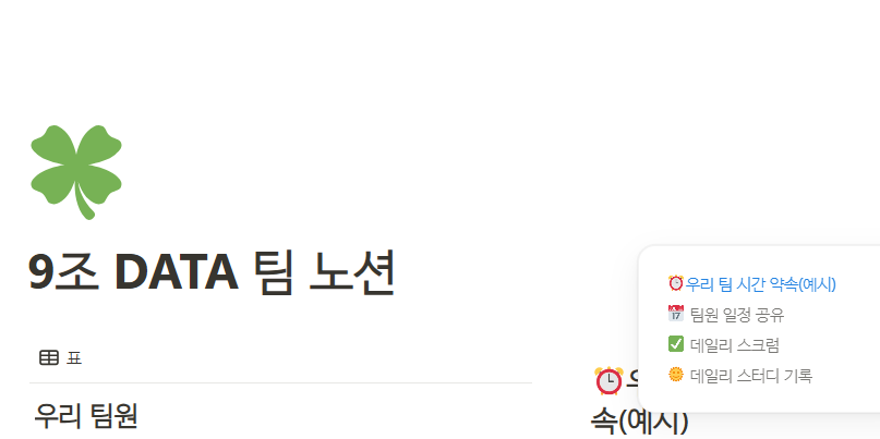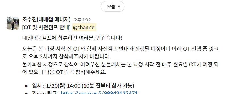 내배캠 사전캠프 총괄 매니저 조수진 님께 줌으로 OT를 받았다. 사전캠프가 전체적으로 진행되는지 설명해주시고 짤막한 질의응답 후 데이터분석 학습실로 이동했다. 그리곤 또 ZEP에서 팀 배정 후 앞으로 사전캠프 기간 동안 혼자서 때론 팀끼리 학습할 간단한 규칙들을 안내해주셨다. 나는 데이터분석_6기의 9팀이 됐고 팀원들과 만나 팀 노션을 작성하기 위해 팀 회의실로 갔다.