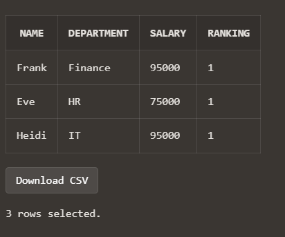 RANK() OVER (PARTITION BY Department ORDER BY Salary DESC) Ranking