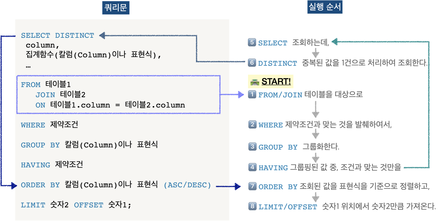- 작성 순서: SELECT - FROM - WHERE - GROUP BY - HAVING - ORDER BY
