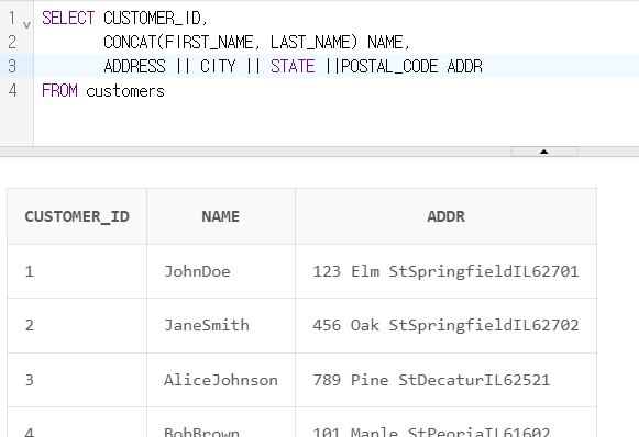 - CONCAT(문자열1, 문자열2) : 문자열1와 문자열2를 연결