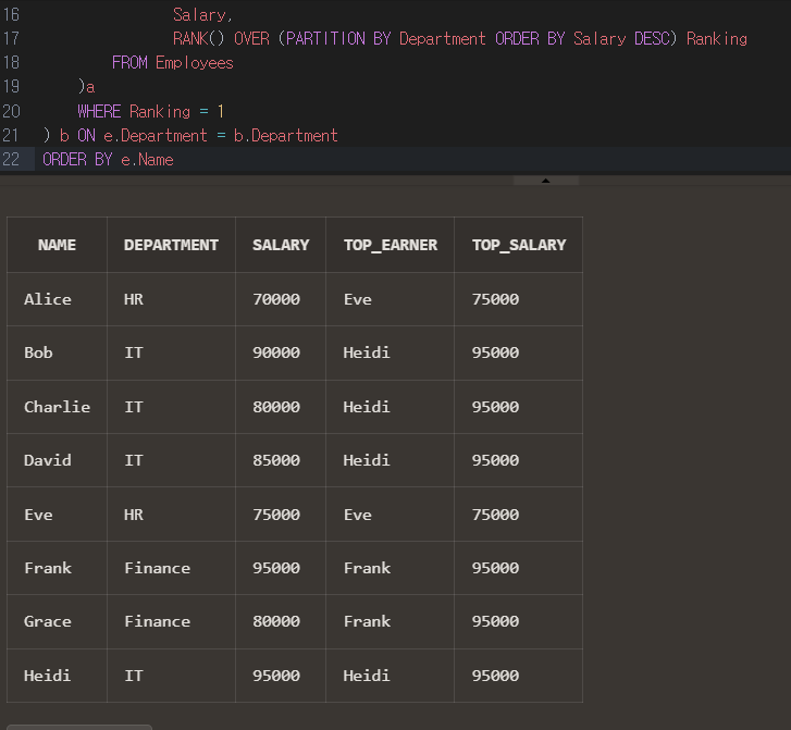 기존의 Employees 테이블에다 LEFT JOIN으로 ①의 테이블을 합쳐주는데, 이때 Department 컬럼을 기준으로 한다.