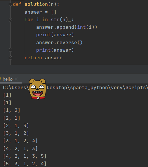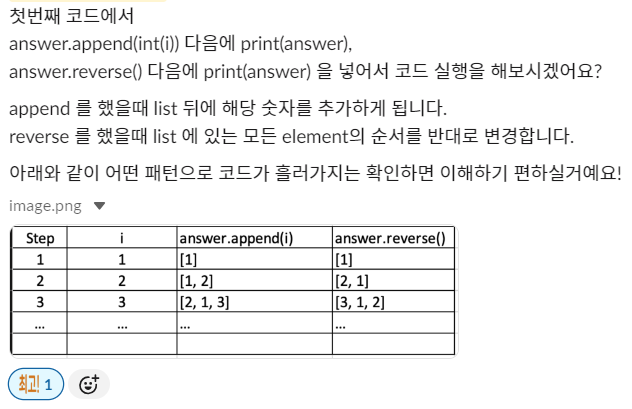 'answer.reverse()' 행의 들여쓰기를 수정했더니 코드가 정상적으로 작동했다..! 들여쓰기가 문제였다니, 왜지?