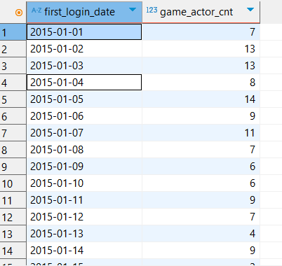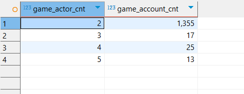 그러면 게임 캐릭터가 2개인 게임 계정은 몇 개인지, 이런 식의 데이터를 볼 수 있다.