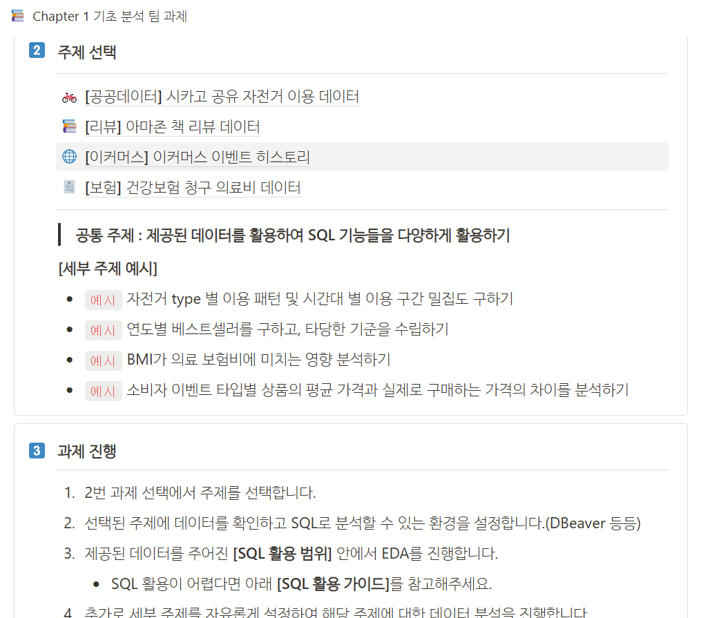 이번 주 팀 과제는 주어진 4가지의 주제와 각 주제에 따라 제공된 데이터를 SQL을 활용해 EDA를 하는 것이다.
