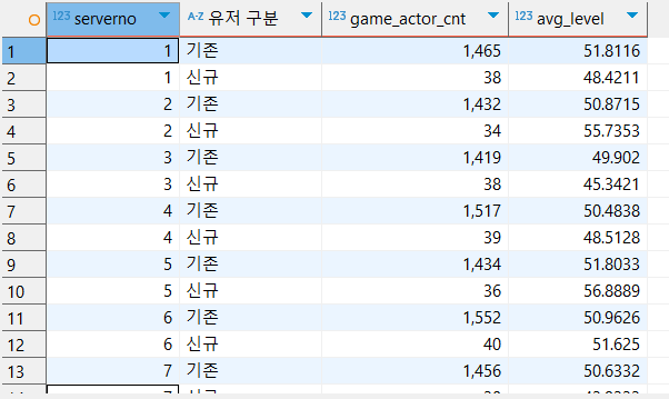 | 조건1) group by 절을 사용하여 서버별, 유저구분(기존/신규) 게임캐릭터id수를 구해주세요. 중복값을 허용하지 않는 고유한 갯수로 추출해주세요. 조건2) 기존/신규 기준→ 첫 접속일자가 2024-01-01 보다 작으면(미만) 기존유저, 그렇지 않은 경우 신규유저 조건3) 또한, 서버별 평균레벨을 함께 추출해주세요. |