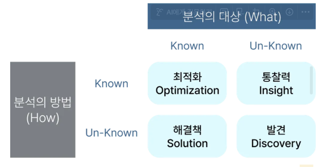 - 통찰력(Insight) : 분석 대상이 무엇인지 모르지만 분석 방법은 알고 있음