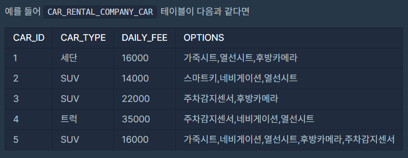 options 컬럼에 데이터가 값이 들어가있는 형태가 각각 분리돼서 들어간 것이 아니라 쭉 열거해 입력됐기 때문에 정확히 일치하는 조건일 때만 사용 가능한 위의 쿼리로는 원하는 결과 테이블이 나오지 않았다.