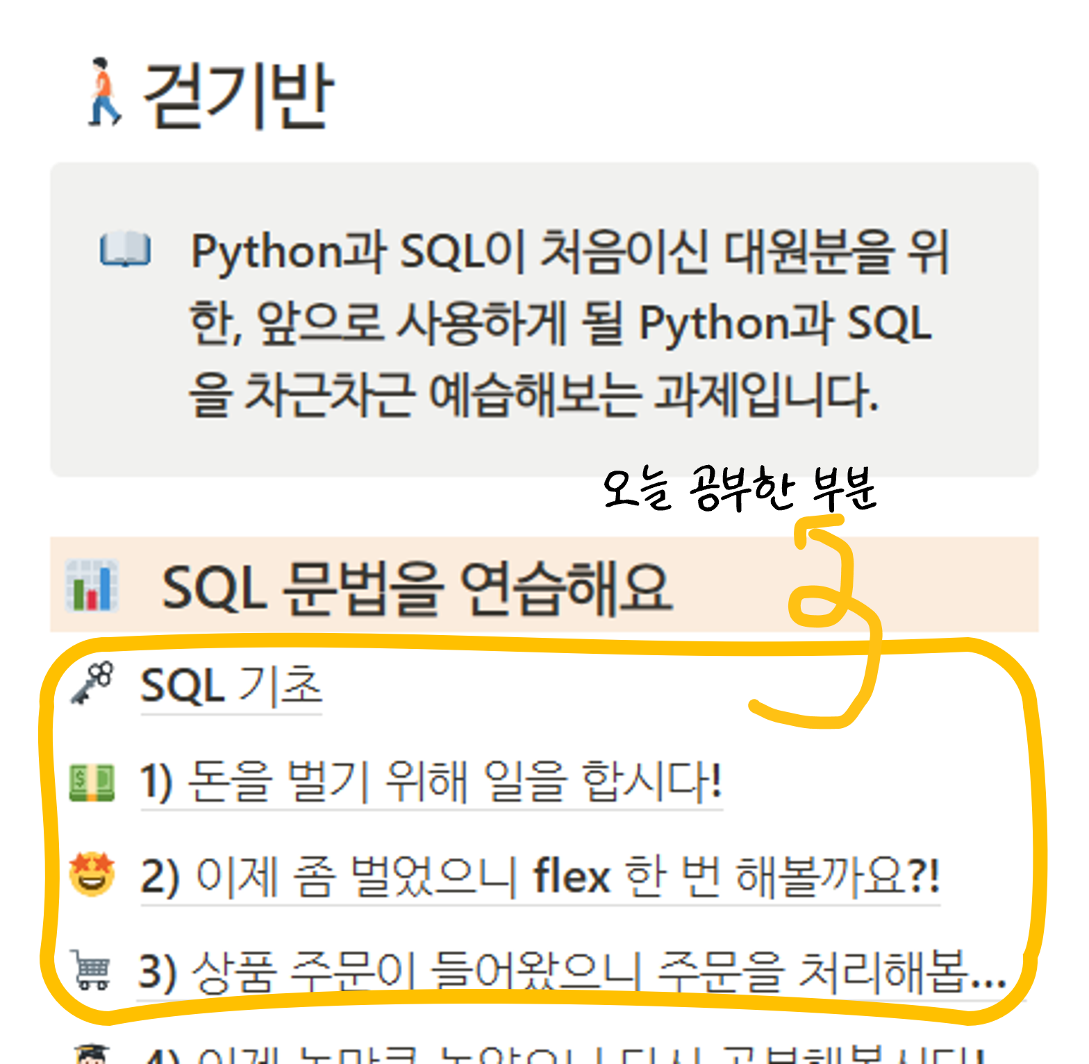 - 어제 공부한 SQL 복습을 사전캠프 개인 퀘스트로 복습하기: 걷기반/SQL 문법을 연습해요/"SQL 기초" ~ "3) 상품 주문이…"