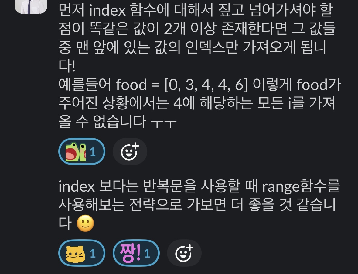 튜터님께서 언급하신 것처럼 food 리스트가 있다고 할 때 food.index(4)라고 하면 계속 2만 나오는 것이고 3은 가져오지 못하는 것이다.
