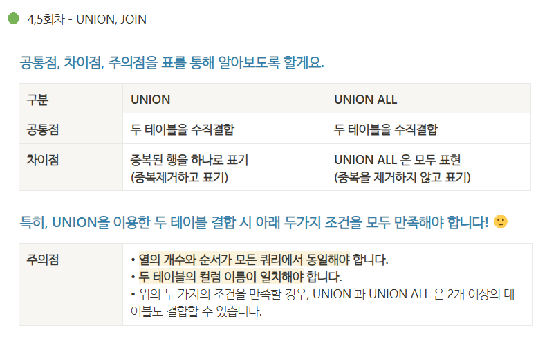 - 합치고자 하는 테이블들의 컬럼 개수와 컬럼 순서가 동일해야 함