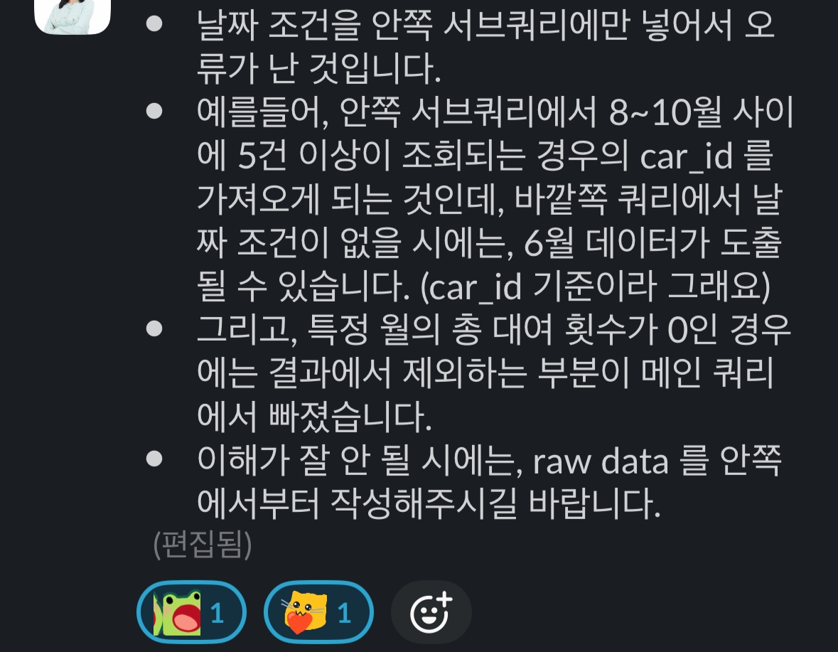 즉 쿼리②처럼 상관 질의 방식을 시도한다고 해서 외부 쿼리의 start_date 제한 범위가 서브쿼리에 설정한 것이 연동되어 적용되는 것이 아니며, 외부 쿼리의 WHERE절에 ⑴car_id를 제한하는 조건, ⑵start_date를 제한하는 조건 2가지 모두가 적어야 한다는 점이었다.