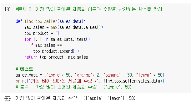 해당 문제는 판매 데이터가 '제품명 : 판매 수량' 한 쌍의 형태로 딕셔너리에 들어 있을 때, 판매 수량이 가장 높은 제품의 이름과 판매 수량을 출력하는 함수를 만들어야 했다.
