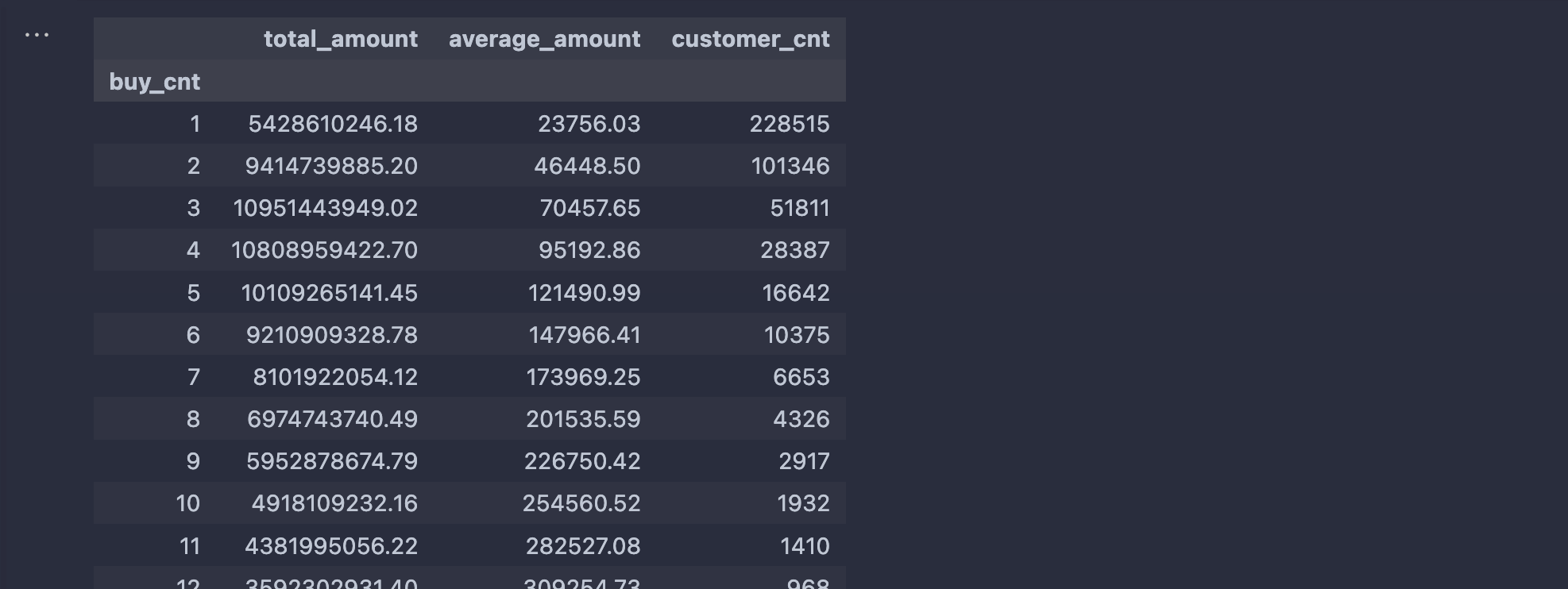 - 구매 건수가 3개인 고객들의 총 판매액은 10,951,443,949.02원으로 2019년 전체 판매액에서 가장 높은 비중(9.73%)을 차지함