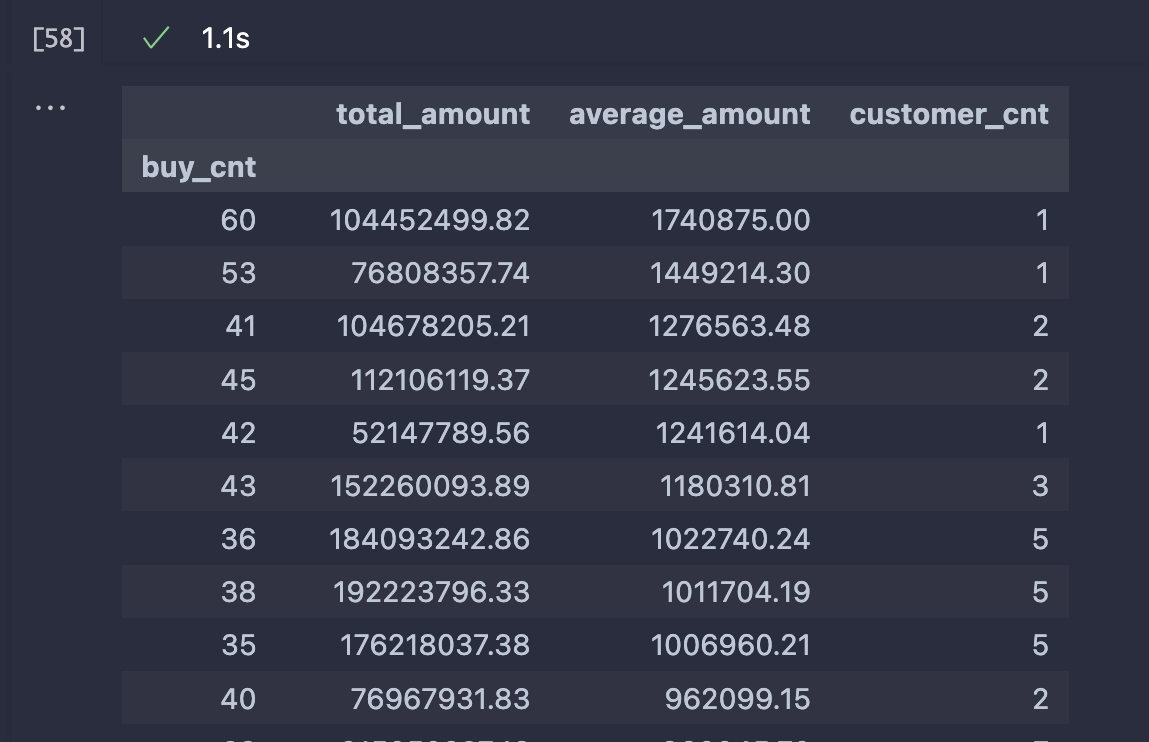 - 구매 건수 1개인 고객이 1인 평균 소비 금액(23756.03원)에 비해 약 4397배에 높은 구매력을 지님
