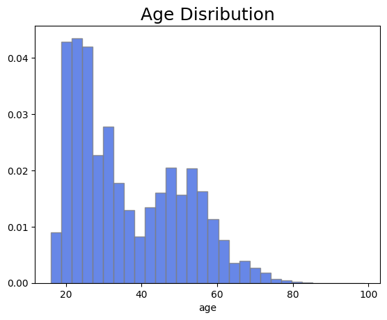 plt.hist(cus['age'], bins=30, density=True, color='royalblue', alpha=0.8, edgecolor='grey')