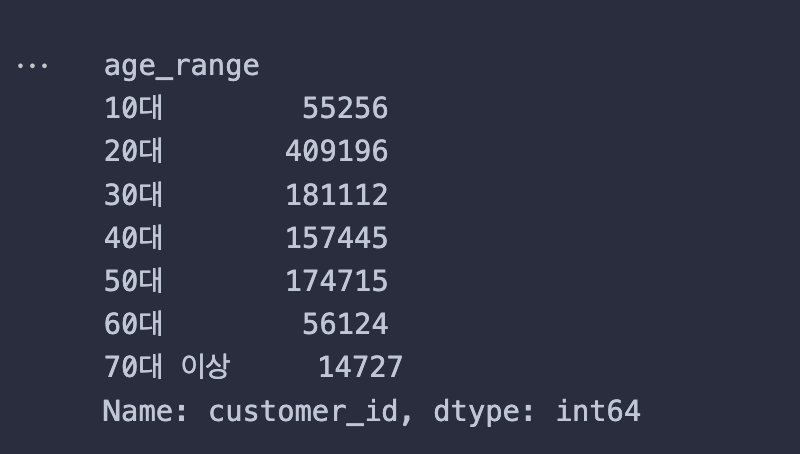 우선 transactions 테이블에 기록된 고객의 수를 집계하기 위해 nunique()를 사용해 집계했다. 그리고 이를 customers 테이블에 저장된 고객들의 수와 비교했다. 2019년에 구매한 고객은 총 458,235명으로 전체 회원 중 43.7%에 해당하는 고객들이었다.