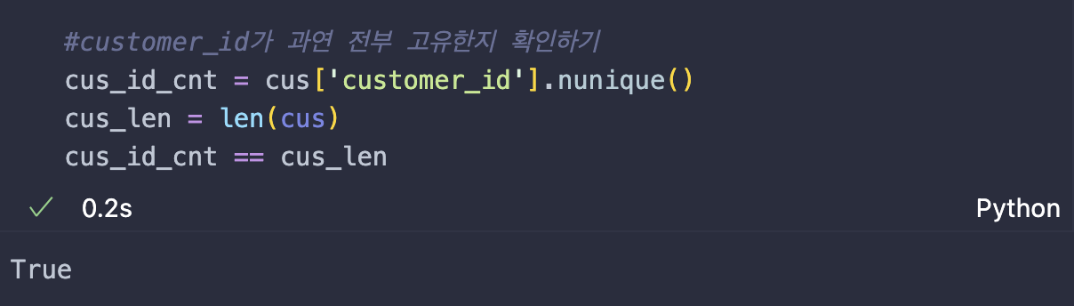 ☑️ ['customer_id'] : 과연 값들이 고유한가 (사실 PK인데 해당 부분도 확인해야 하나 싶었지만 했음)
