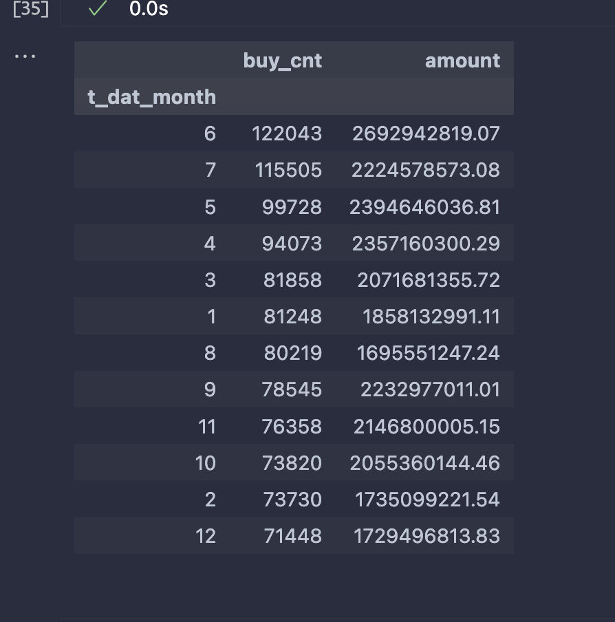 얼핏 보기에 6월이 구매 건수도, 총 판매액도 가장 많고 가장 높다는 걸 알 수 있지만 각각의 순서를 알고 싶어서 정렬 기준을 달리 해보기도 했다.