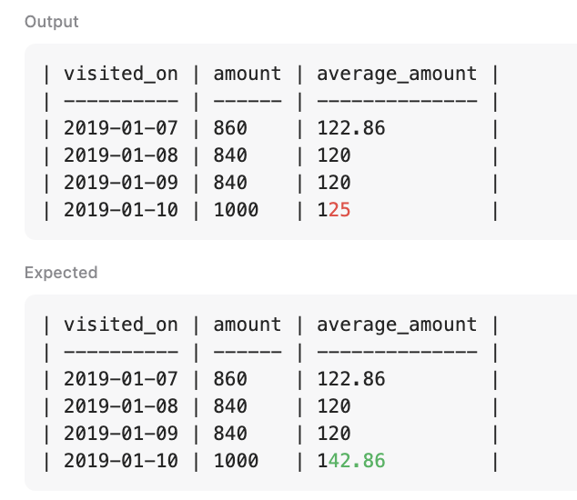 윈도우 함수에서 범위 지정하는 문법에 대해 찾아보고서 해당 내용을 참고해 첫 번째 쿼리를 작성했는데 왜인지 amount 컬럼은 7일치 계산이 잘 됐는데, average_amount 컬럼은 계산이 요구한 대로 되지 않았다.