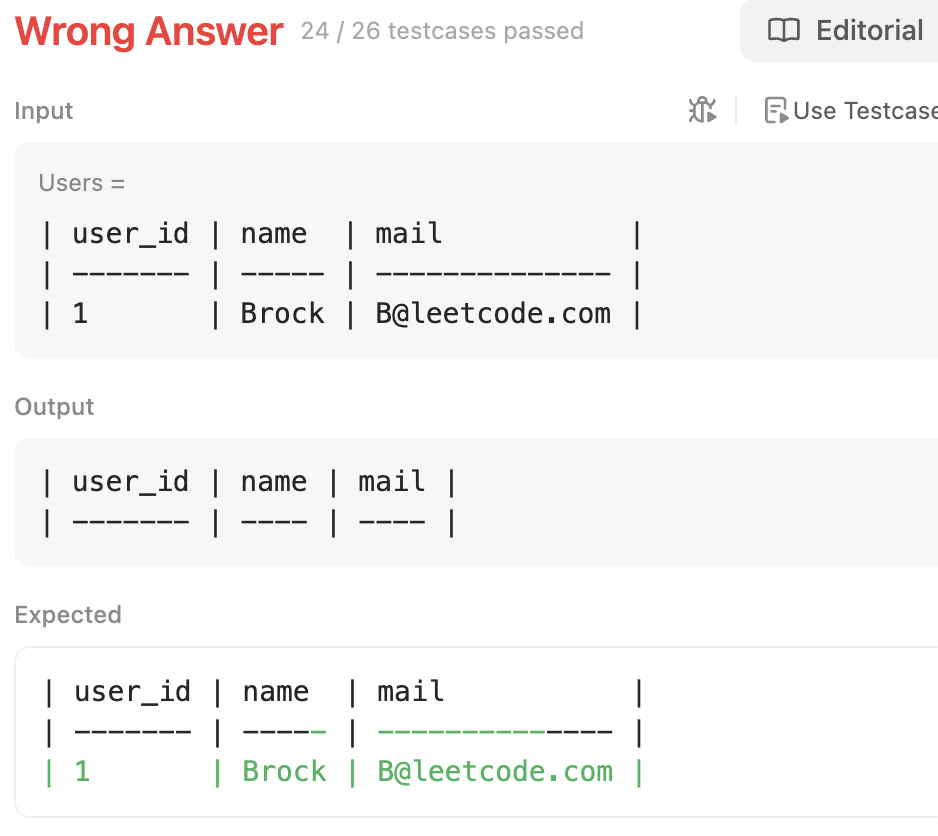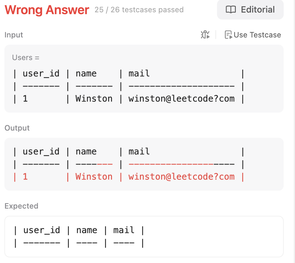 수정한 쿼리로 testcase 24는 통과했는데, 바로 다음 사례에서 또 오답 처리가 됐다. 이번에는 도메인에 작성한 .이 문자 그대로의 .이 아니라 임의의 문자 하나로 인식되며 leetcode?com도 통과시킨 것이 문제였다.