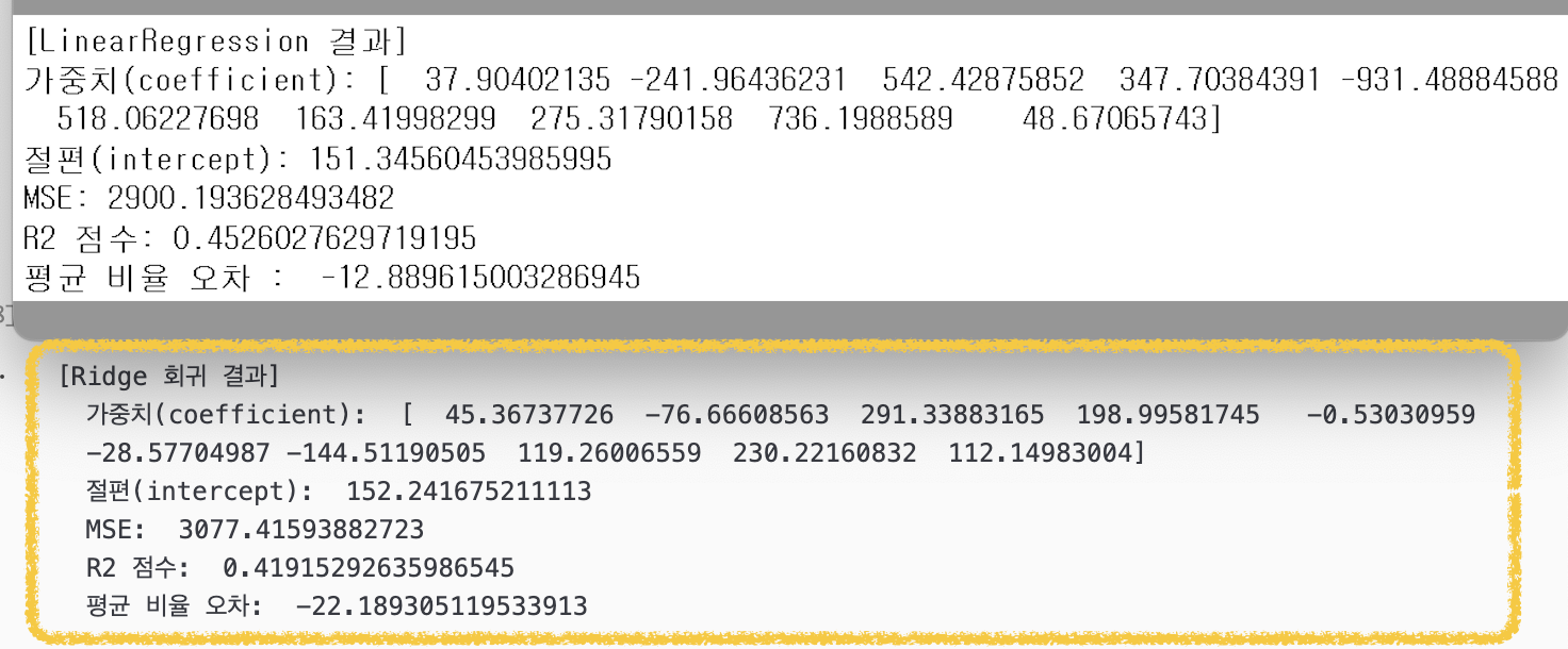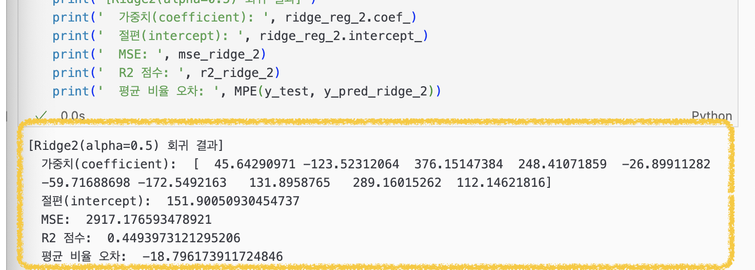 0.5로 규제 세기를 완화시켰더니 [Ridge 회귀 결과]보다 [Ridge2(alpha=0.5) 회귀 결과]가 예측 성능이 더 나아진 결과를 보였다.