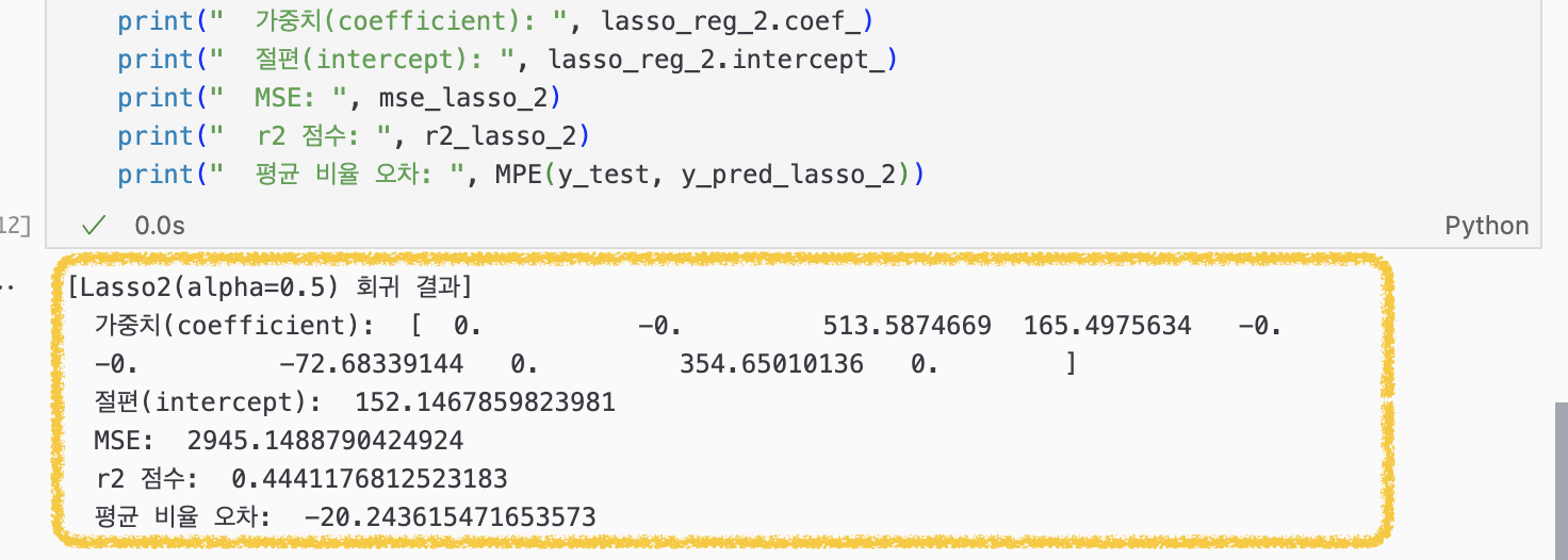 그래서 아까 ridge 회귀에서 그랬듯이, Lasso 회귀에서도 alpha 값을 0.5로 낮춰서 다시 돌려봤더니 0으로 날라가지 않은 컬럼이 하나 더 늘었다(순서대로 'bmi', 'bp', 's3', 's5').