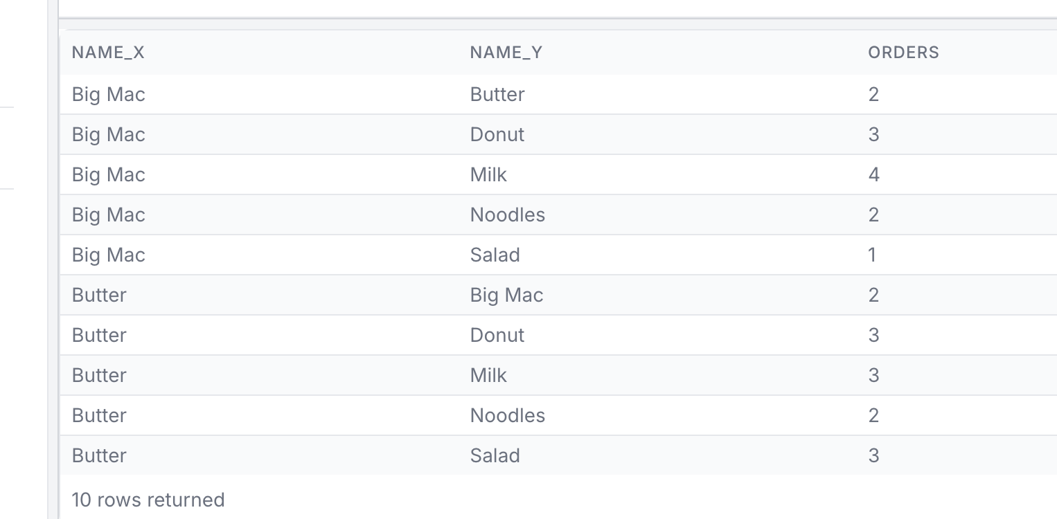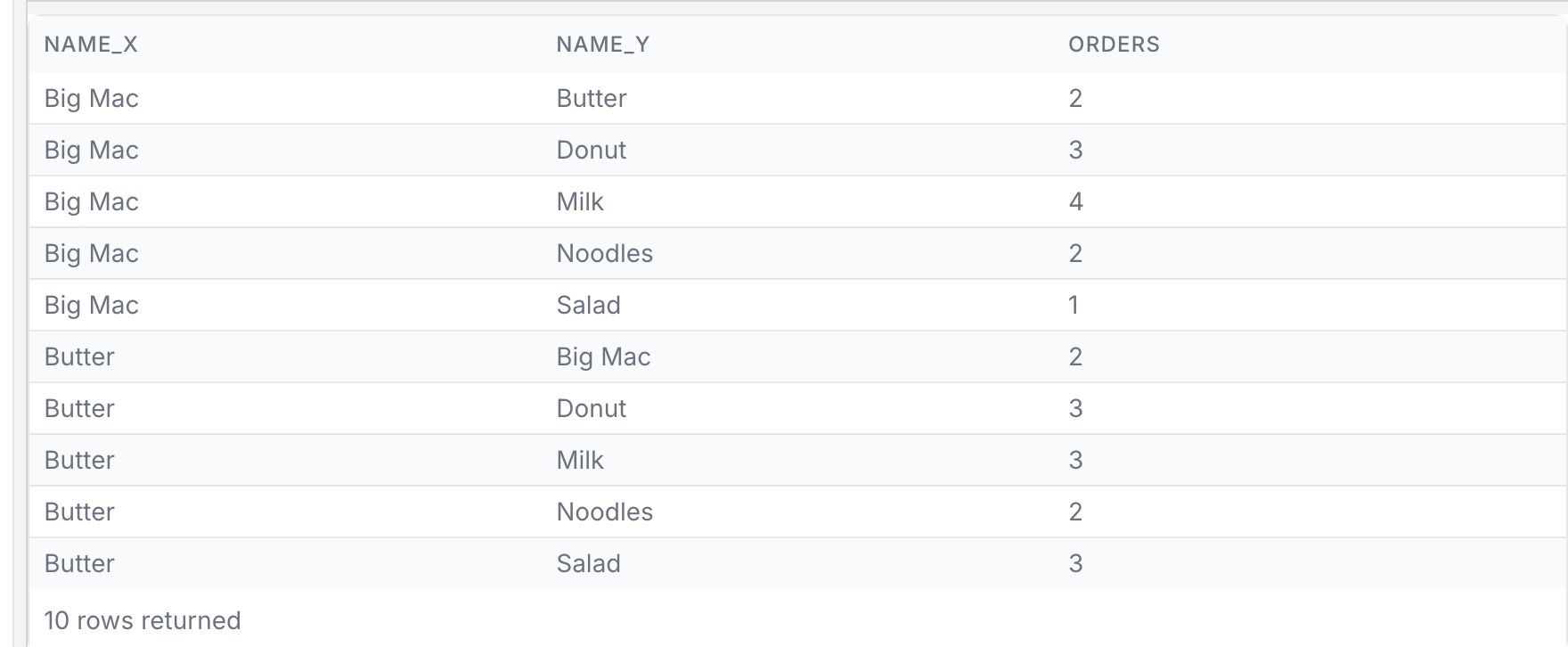 - 결과는 각 제품 쌍과 해당 제품이 함께 포함된 주문 수를 반환해야 합니다.