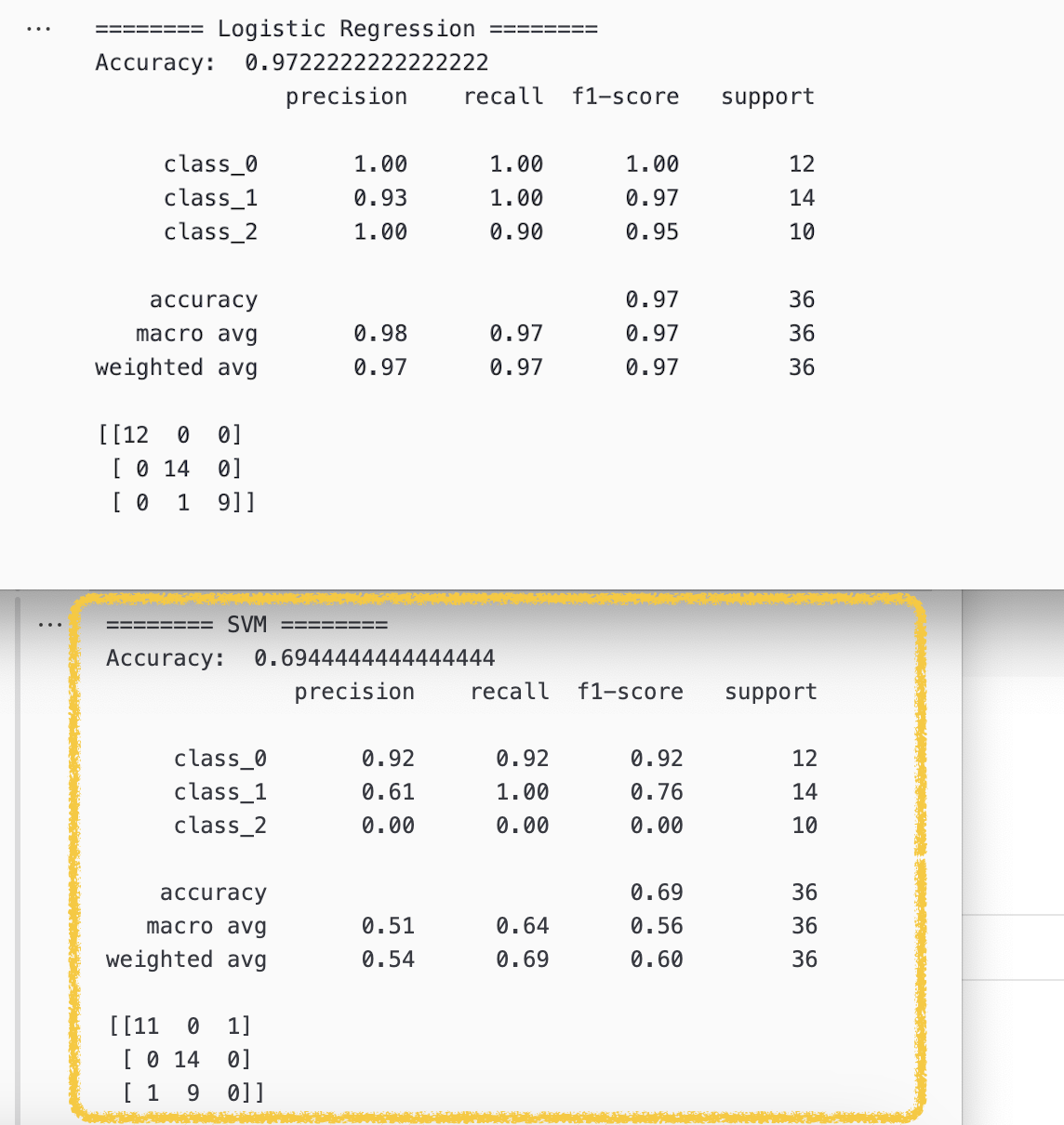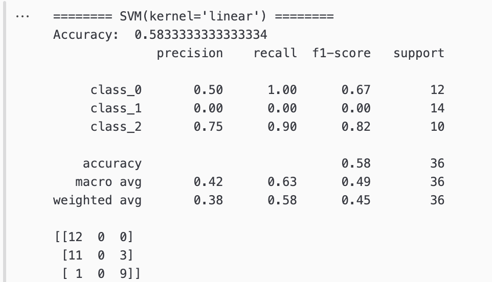 ...? 근데 정확도가 왜 이러지. class_2는 정밀도도, 재현율도 왜 저러는 거지...?? 혼동행렬을 보면 class 2에 해당하는 것들을 class 2로 나눈 것은 0이라는 충격적인 결과를 확인할 수 있다.