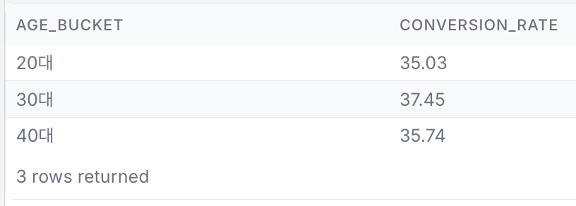 2023년 1월 1일이 포함되게 WHERE절을 수정하고, 백분율을 구하고서 반올림하는 순서로 수정한 후에 실행한 결과 테이블이다. 전환율을 확인하니 값이 제출한 쿼리와 조금 변했지만 여전히 오답이다. 튜터님의 정답 쿼리에 의하면 20대: 35.03%, 30대: 37.45%, 40대: 35.74%가 나와야 한다.