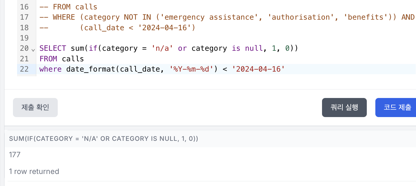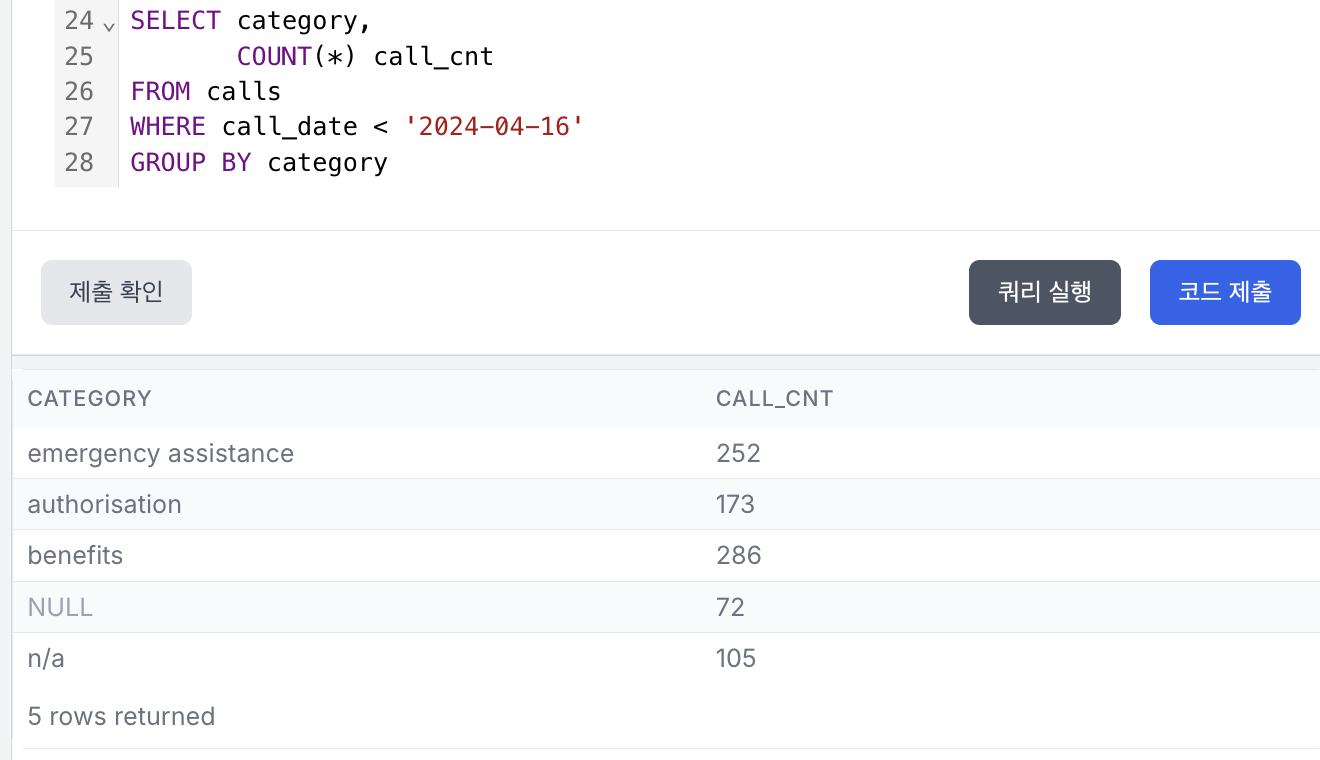 혹시나 나는 튜터님처럼 call_date를 DATE_FORMAT()으로 안 정리하고서 그냥 해서 그런가 싶어서 튜터님과 동일하게도 바꿔봤지만 그건 의미가 없었다(참고로 나는 테이블 설명에서 call_date의 데이터 타입이 타임 스탬프이길래 날짜 형식으로 변환해주지 않아도 싶겠다 생각했다).