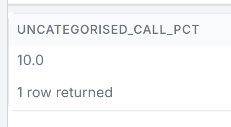 튜터님의 답안을 보면 uncategorized_call_pct를 구할 때 가장 최종 단계에서 반올림을 한다(분류되지 않은 상담 건수를 전체 상담 건수로 나누고 → 그 다음에 100을 곱하고 → 소수점 둘째 자리에서 반올림하기). 그런데 나는 반올림을 하고서 100을 곱해서 문제가 발생했다.