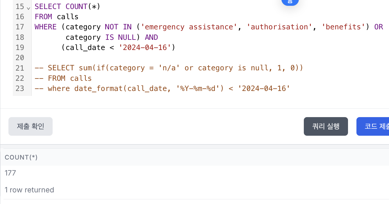 굳이 내가 제출했던 쿼리를 정답이 되게끔 고치자면 위와 같이 고칠 수 있다. 그러나 사실 딱히 좋은 방식은 아니다. category에 새로운 범주가 추가되면 그때마다 WHERE절에 추가해줘야 하니 말이다. 그런 점을 고려해서 한 번 더 고쳐서 세 번째 쿼리까지 써봤다(여전히 튜터님의 정답 쿼리에 비하면 가독성이 안 좋지만).