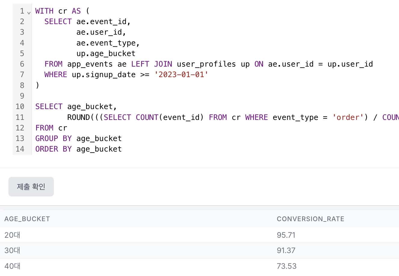 뭐가 문제라 내가 작성한 쿼리에선 큰 값이 나왔을지를 보는데 분자인 order 이벤트를 집계하는 방식이 문제였다. 스칼라 서브쿼리를 사용하게 되어 GROUP BY절에 명시한 대로 age_bucket별로 order 이벤트를 집계하지 못하고 있다. 분모는 GROUP BY절에 의해 연령별로 집계되고 있으나, 현재 분자가 전체 cr 테이블에서 모든 order 이벤트 건수로 고정돼 있는 상황인 것이다.