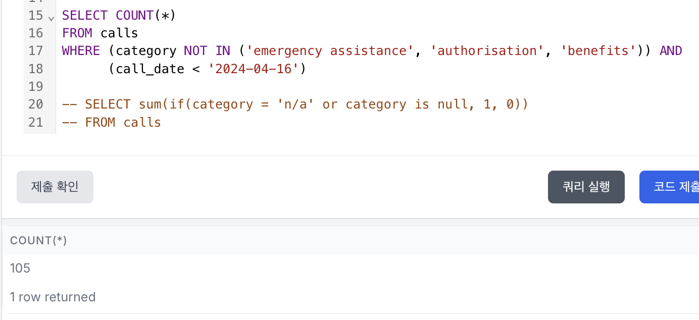 emergency assistance가 252건, authorisation이= 173건, benefits이 286건, 분류되지 않은 상담(NULL 혹은 n/a)이 총 177건으로 집계됐는데, 나는 105건인 것을 보면 n/a만 집계된 것 같다. COUNT(*)로 집계하면 NULL값인 행을 포함하여 집계한다고 알고 있었는데 그렇게 집계되지 않은 이유를 모르겠어서 튜터님께 질문하러 갔는데, WHERE절에서 NOT IN으로 거르는 과정에서 문자열이 아닌 NULL값이 걸러지며 n/a만 집계된 것 같다고 답변해주셨다.