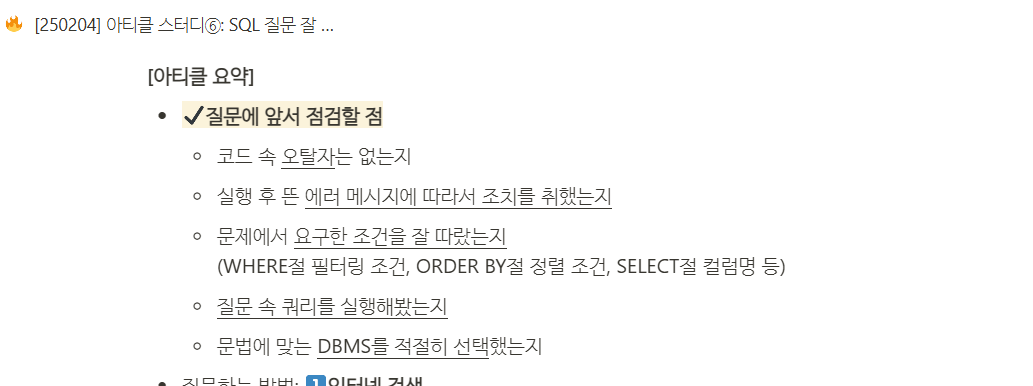 오늘 아티클은 SQL을 공부하면서 발생하는 질문들을 어떻게 하면 잘할 수 있는지를 알려준다. 질문 전 점검 목록을 비롯해 여러 팁들이 있어서 잘 적어가면서 읽었다. 사실 어떤 공부를 하든, 또 그 분야에 있어서 내 지식 수준이 어떻든 질문은 생긴다. 그리고 이 질문을 내가 모르는 것을 알아가는 앎의 확장은 단순히 아는 지식의 양이 늘어나는 양의 증가뿐만 아니라 학습의 깊이에 영향을 주는 질적 향상에도 영향을 미친다. 고로 질문을 잘하는 방법을 터득한다는 건 어쩌면 많은 정보들을 아는 것보다 더 중요한 일이다.