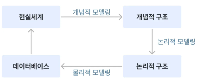 - ①개념적 데이터 모델링 현실세계→개념적 구조