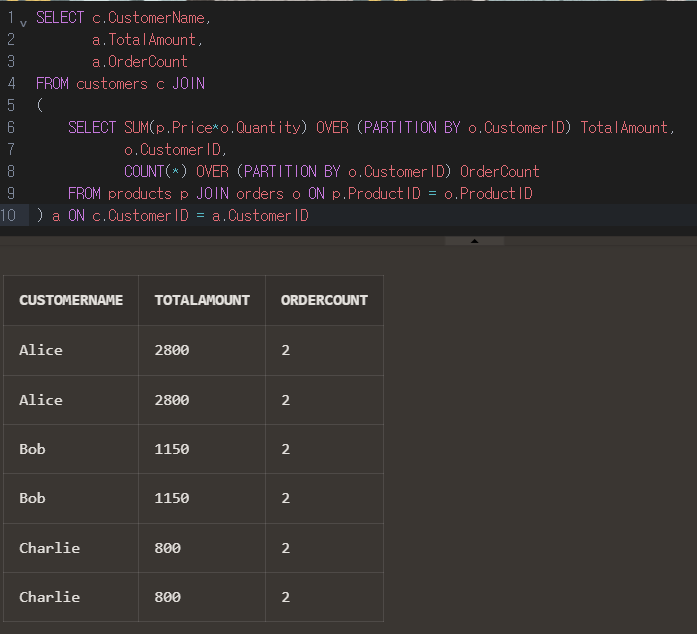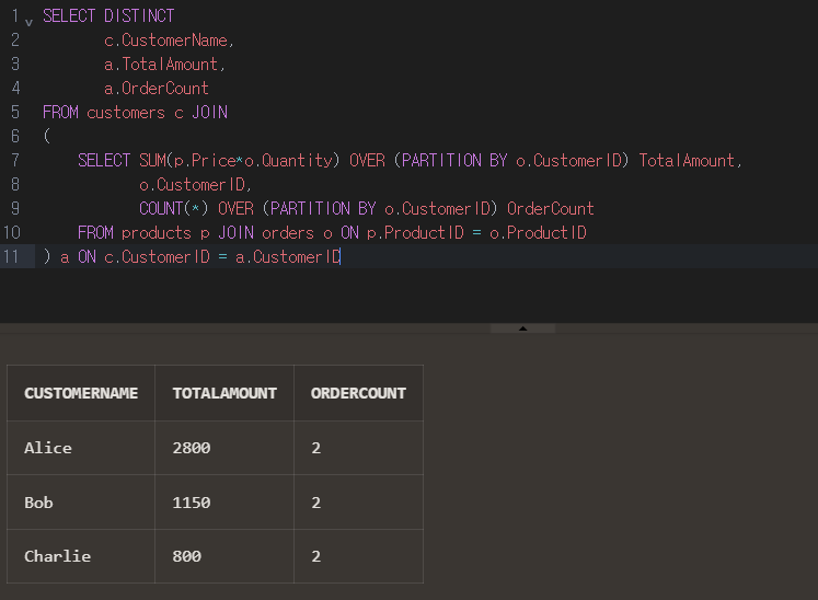 그리고 SUM() OVER를 이용해서 고객별로 총 금액(제품 가격*제품 수량을 모두 합한 값)을 구하는 쿼리를 작성하고서 TotalAmount라고 별명을 붙였다.