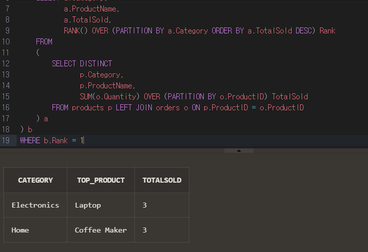 그리고 위의 부분을 또 서브쿼리로 묶고서 마지막 결과 테이블로 카테고리별 총 판매량 1위의 제품명과 총 판매량만 조회되게 쿼리를 작성했다.