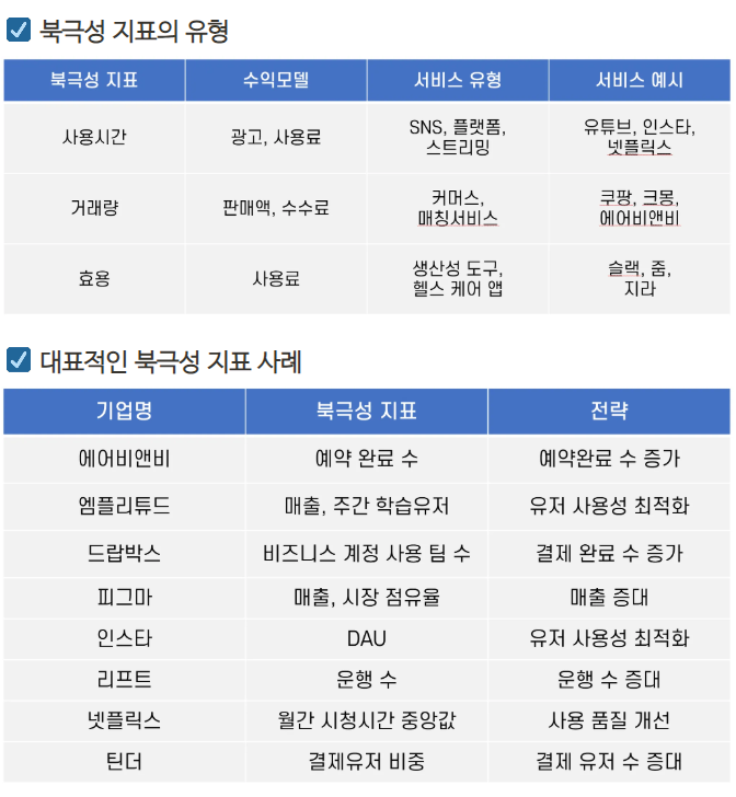 - 여러 지표들 중에서 서비스의 성공을 정의하는 지표 어떤 지표들을 봐야 자사 제품/서비스의 성장을 확인할 수 있는가