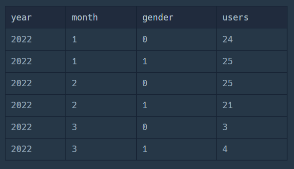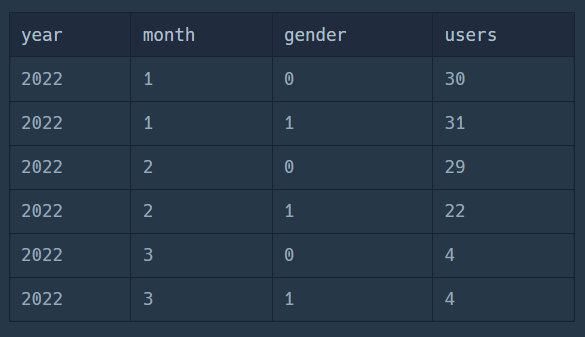 GROUP BY YEAR(os.sales_date), MONTH(os.sales_date), ui.gender