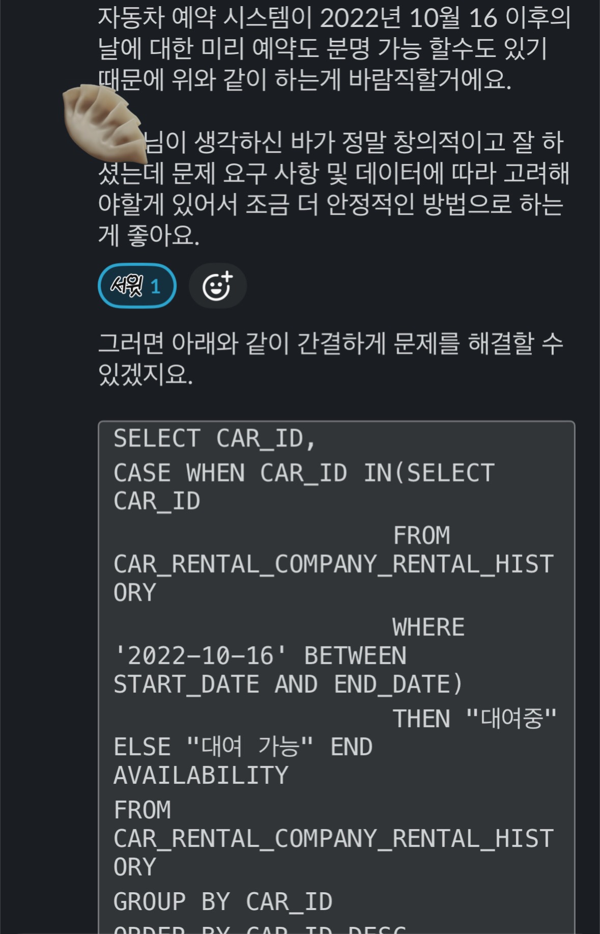 그러니 car_id별 2022년 10월 16일 기준으로 availability 컬럼의 값이 1건만 조회되도록 하기 위해선 다른 방식으로 작성해야 했다.