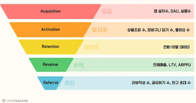 Acquisition(고객 유치) → Activation(활성화) → Retention(재방문/재구매) → Revenue(수익) → Referral(추천)으로