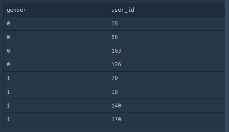 그래서 데이터 건수가 적은 2022년 3월 데이터를 기준으로 성별과 회원 ID를 조회해봤더니 user_id가 68인 사람이 2번 조회되는 것을 보면 이래서 COUNT(DISTINCT os.user_id)로 적어야 함을 깨달았다.