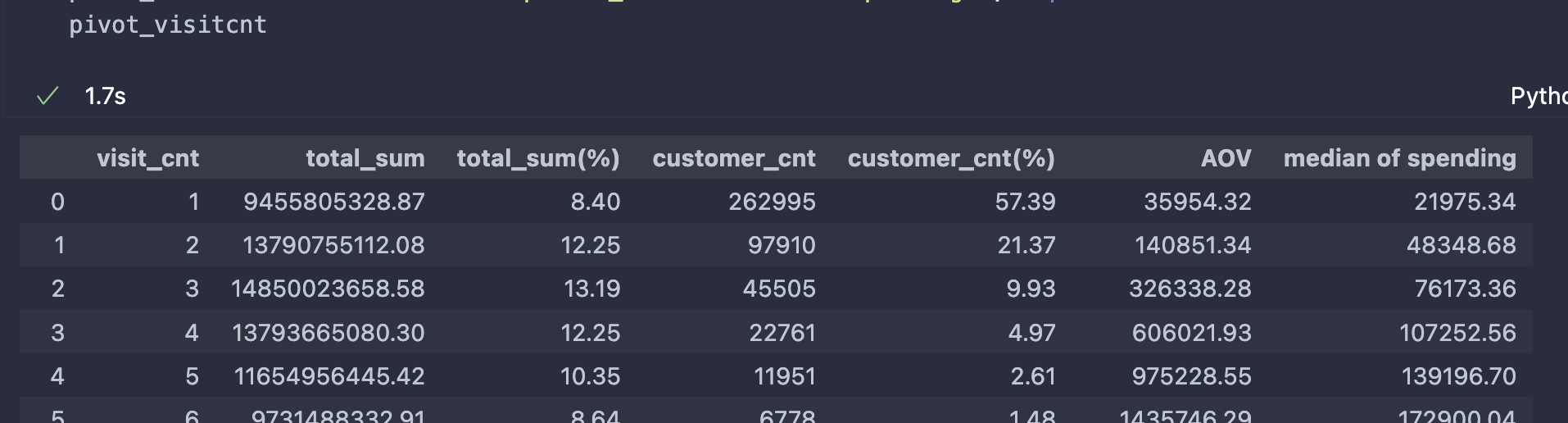 위의 테이블 pivot_visitcnt은 방문 횟수를 기준으로 소비액, 고객 수, 객단가 등을 구한 테이블이다. 각 컬럼들을 소개하자면,