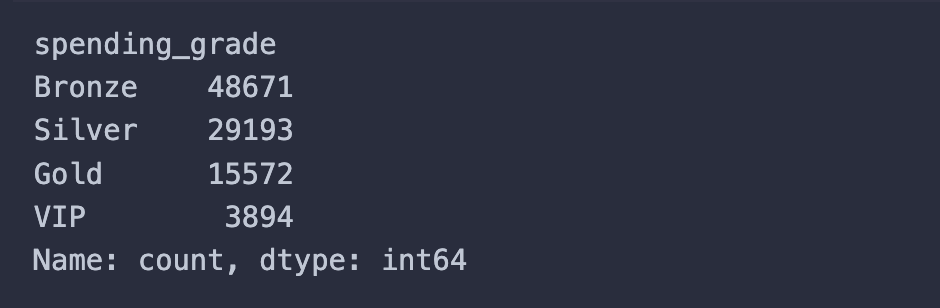 sum_per_cusid['spending_grade'] = pd.cut(sum_per_cusid['price3_KRW'], [0, 100000, 180000, 350000, sum_per_cusid['price3_KRW'].max()], labels=spending_grade)